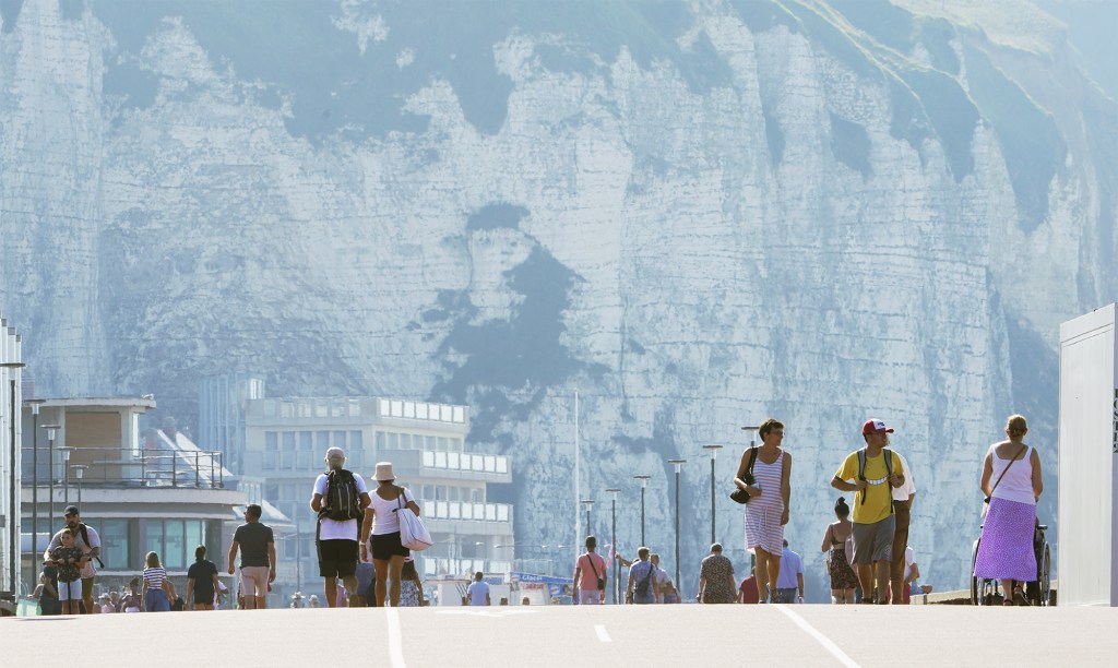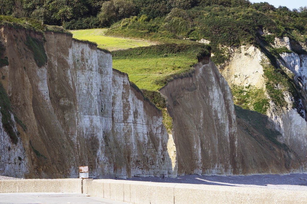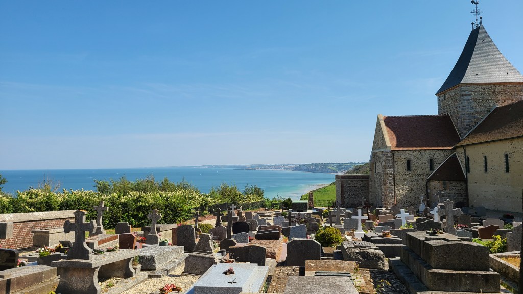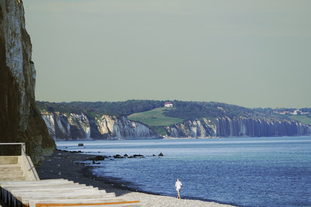Je ne mens pas quand je vous dis que la plage était bondée.. et plage de galets en plus! (oui, la mise au point est sur le fond 😊)j’ai hésité à aller le voir et le réveiller pour lui dire qu’il crâmait, mais vue la position de ses mains, il ne dormait pas je pense… Ou bien il a voulu fuir la chaleur, mais trop tard 🤷♂️A Dieppe, il y a un grand front de mer, avec au sud les premières énormes falaises. Je trouve cette vue assez impressionnante, non?Même Robert et Jacqueline n’en reviennent pasIl y a même des motards tout fiers qui paradent sur le front de mer (en vrai, c’etait le cortège des mariés, on aperçoit la mariée au fond à gauche qui salue la foule en délire… 🥳)Même les mouettes ont choisi d’assister au défilé de bécanesEn tout cas, on vous rassure, même si l’immeuble est en vente, tout va bien. Lui, il espère surtout que ses maîtres ne vont pas vendre car il adore poser sa tête sur la barrière et fixer les photographes qui passent dans la rueet non loin du chat, on aperçoit la fameuse chapelle de Notre-Dame de Bonsecours sur la colline au nor dde Dieppe. Elle est flippante avec la croix, non? 😱😄Même pas peur de la chapelle pour ces deux-là, à qui il ne manque juste que les chipos et les merguez pour qu’ils soient les plus heureux du monde, face au soleil qui commence à se coucher sur la mer. Pépères tranquillous.en fait, ils regardaient plutôt cette personne en train de nager clairement dans de l’or liquideLe lendemain, je décide de rejoindre les falaises de Varengeville, son église et son célèbre cimetière donnant sur la mer, qu’on distingue à peine sur la droite de la photo. Je dois jouer avec les horaires de marées car il ne faut pas marcher trop en dessous des falaises, car ces dernières s’érodent fortement et peuvent s’ébouler n’importe quand.Ces falaises sont juste super impressionnantes, et offrent un formidable contraste avec la verdure sur leurs sommets. J’adore! 😍L’église et le cimetière de Varengeville : sans doute l’un des plus beaux cimetières en France. Tou au fond, c’est Dieppe. Il y a pire comme site pour une dernière demeure, non?L’élégante normande. Cette image pourrait avoir 100 ans, elle serait la même, non?Ces deux-là surveillaient sagement leurs maîtresEn 100 ans, les falaises ont reculé de 80m : ce bunker a été construit en haut de la falaise.. et se retrouve donc 80 ans plus tard en bas sur la plage. C’est foufou cette érosion! 😯Ce jour là, je terminais par un très joli coucher de soleil.