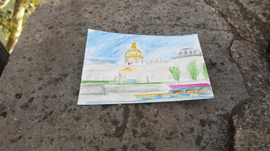 Elle avait glissé ce dessin : le dôme de l’Institut (là où siègent les académiciens pour ceux qui ne connaissent pas) au bout du pont des Arts dessiné aux crayons de couleurs aquarellables.