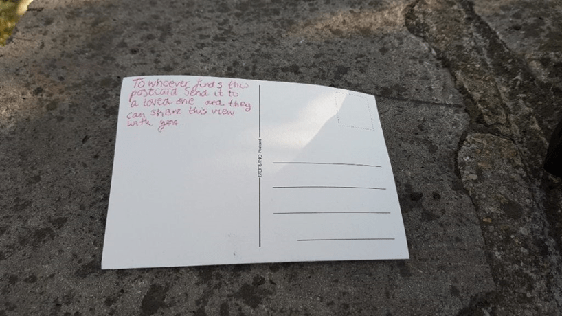 « To whoever finds this postcard. Send it to a loved one and they can share this view with you ».